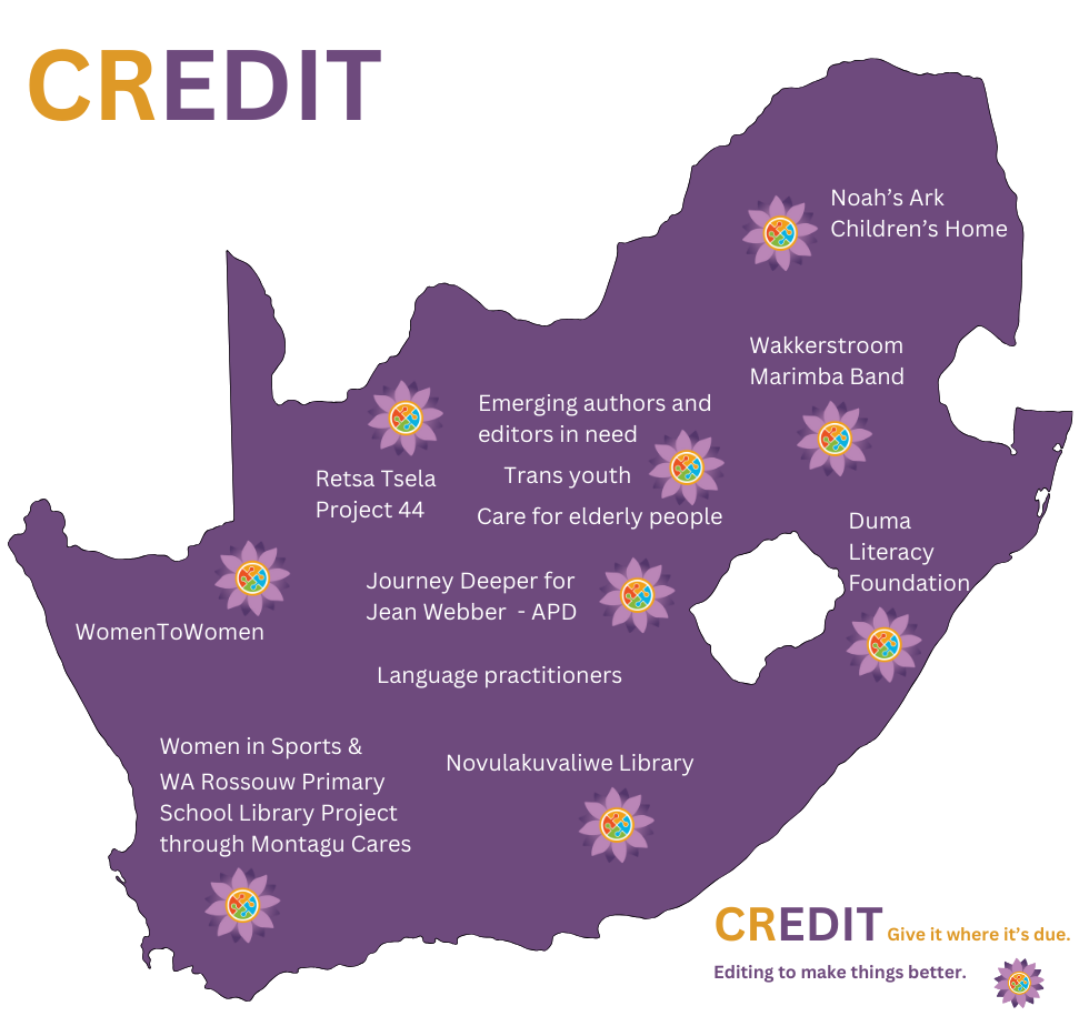The three Credit series of 2025 raised funds to support women in sports, children’s literature, a school library project, people with disabilties, a marimba band, emerging authors and editors in need, language practitioners, trans youth, women affected by GBV, children without families and a community-led clean up project. Nine provinces were touched. CREDIT is making things better: better for others and better for editors.
